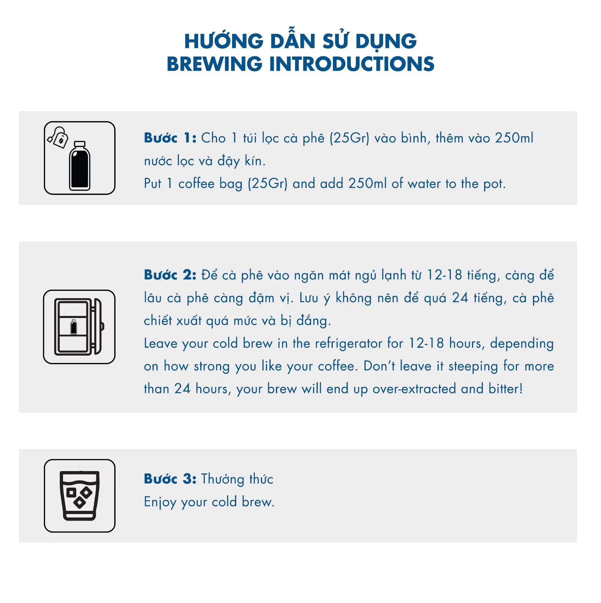 • Hướng dẫn sử dụng: Bước 1: cho 1 túi lọc cà phê (25Gr) vào bình, thêm vào 250ml nước lọc và đậy kín. Bước 2: để cà phê vào ngăn mát ngủ lạnh từ 12-18 tiếng, càng để lâu cà phê càng đậm vị. Lưu ý không nên để quá 24 tiếng, cà phê chiết xuất quá mức và bị đắng. Bước 3: Thưởng thức.