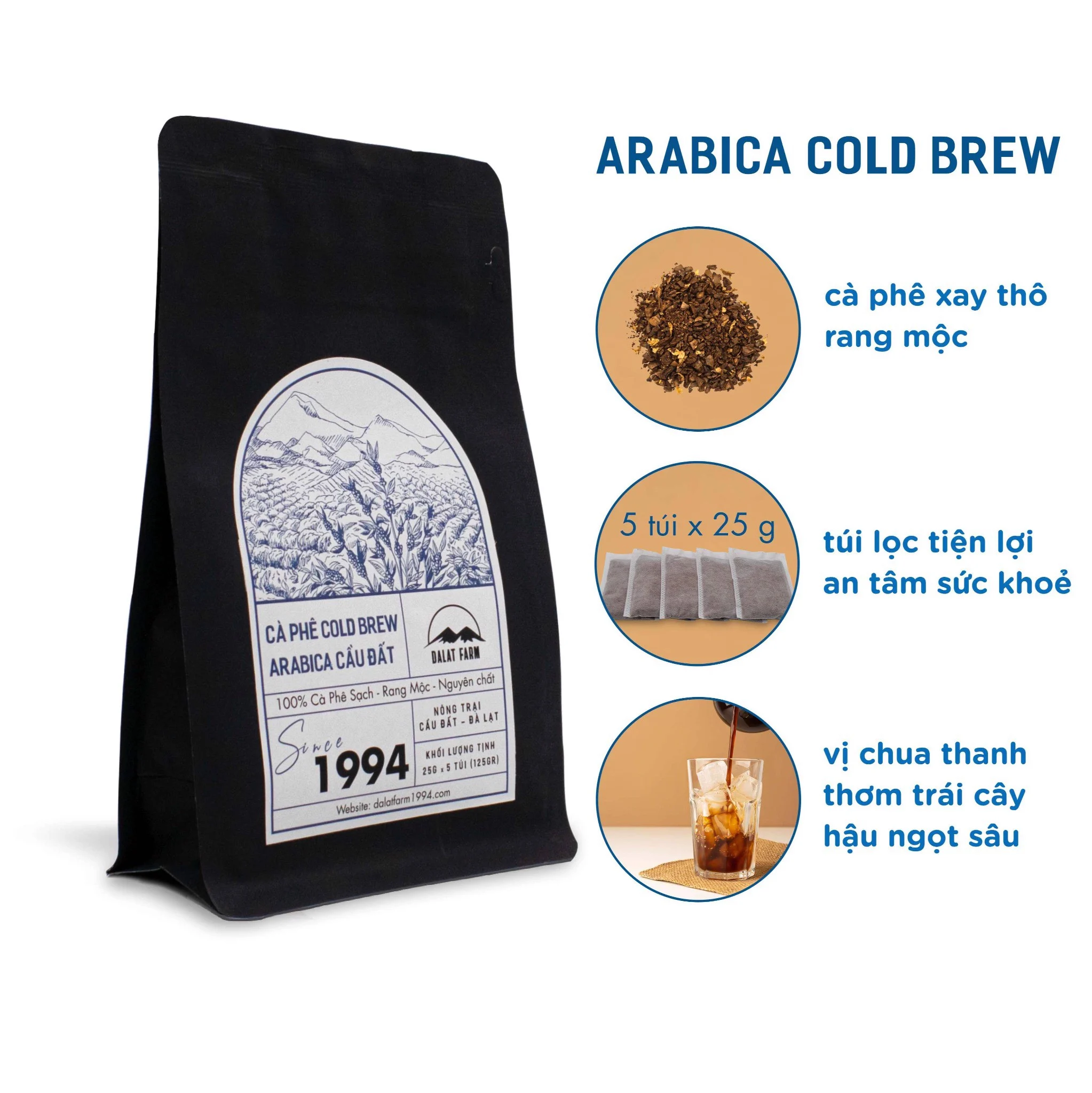 Cà phê Cold brew đựng sẵn trong từng túi lọc vải không dệt đã qua kiểm nghhiệm (25 g/ túi), tiện lợi, an tâm sức khoẻ.