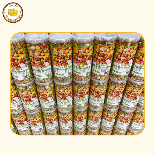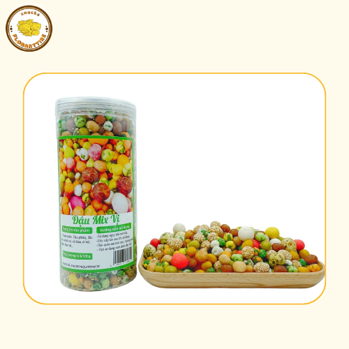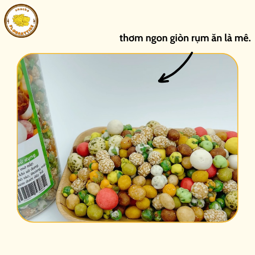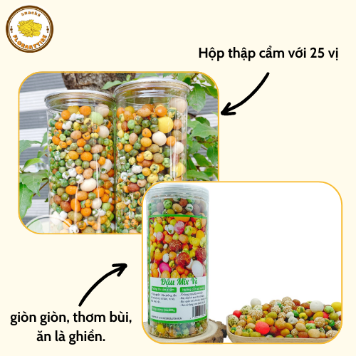 HẠT ĐẬU MIX CÁC VỊ: thơm ngon giòn rụm ăn là mê. Người lớn hay trẻ con đều thích, lại đủ chất dinh dưỡng nữa nhé Hộp thập cẩm với 25 vị , giòn giòn, thơm bùi, ăn là ghiền đấy ạ. Thành phần: Đậu phộng, đậu hà lan, bột mì, mè trắng, tỏi, ớt.... Trọng lượng: 500gr (tính cả bao bì) Hạn sử dụng: 3 tháng kể từ ngày sản xuất Bảo quản: Để nơi thoáng mát, tránh nắng. Đậy kín, bảo quản lạnh với đồ tươi. Lưu ý khi dùng:Rửa tay sạch, tránh ăn bằng tay trực tiếp. Ngưng sử dụng nếu có mùi lạ hoặc hư hỏng. Công dụng của đồ ăn vặt: Giảm đói, duy trì năng lượng, tránh tụt mood giữa giờ học/làm. Tăng hiệu suất tập trung nhờ một số món bổ não như hạt, socola. Giải tỏa căng thẳng, tạo cảm giác vui vẻ, thư giãn. Gắn kết tình bạn, dễ chia sẻ, dễ bắt chuyện. Bổ sung dinh dưỡng nếu chọn món lành mạnh như hạt, sữa chua, rong biển. Bảo hành – Đổi trả: Đổi hàng miễn phí trong 2 ngày nếu sản phẩm bị hư, giao sai, thiếu món (có video/ảnh kèm). Không áp dụng đổi trả nếu lý do là không hợp khẩu vị hoặc bảo quản sai cách. Chăm sóc khách hàng: Tư vấn tận tình, hỗ trợ nhanh chóng qua Fanpage. Ưu đãi cho khách quen: freeship, tặng topping, voucher. Luôn lắng nghe góp ý và xử lý khiếu nại có tâm.