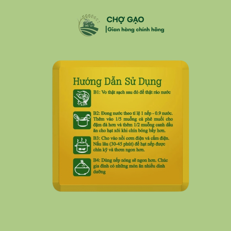 Cách nấu: Vo sạch gạo trước khi nấu. Tỷ lệ nước/gạo khuyên dùng khoảng 1 : 1.2–1.3 (tùy khẩu vị). Sau khi cơm chín (~30 phút), giữ thêm ~10 phút để cơm ráo hơn. Tránh mở nắp hoặc đảo cơm khi nấu để cơm lên đều và ngon hơn.