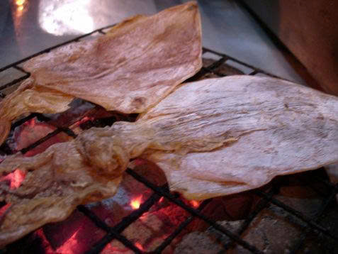 Không tẩm ướp, không thêm gia vị – chỉ cần nướng than lửa liu riu, cuộn mực lại đập nhẹ và xé sợi, chấm với tương ớt hoặc muối tiêu chanh là đã đủ "gây thương nhớ".