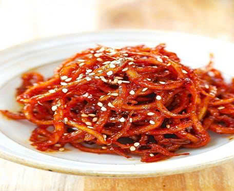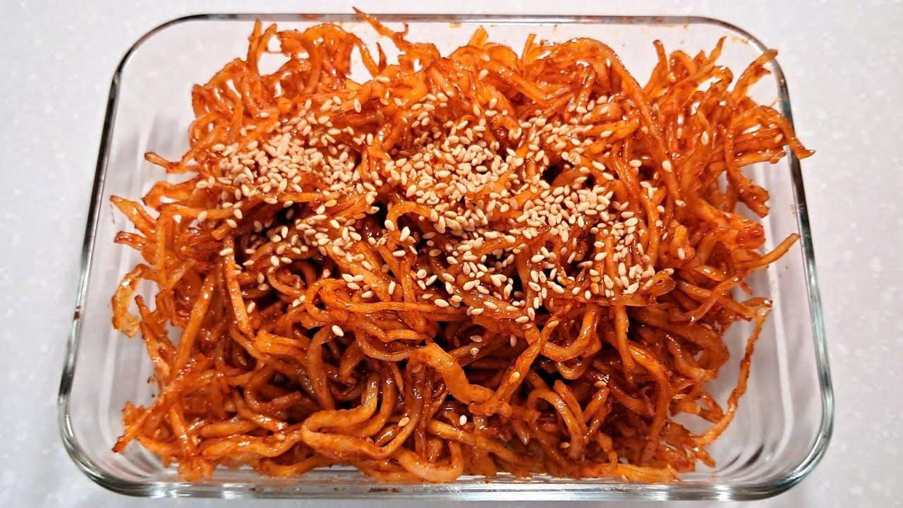 Mực khô được xé nhỏ, rim cùng nước sốt Hàn Quốc đặc trưng (tương ớt Gochujang, tỏi, mè rang, mật ong…) trên lửa nhỏ đến khi sệt lại và thấm đều từng sợi mực. Kết cấu mềm – dai – dẻo, thơm lừng, vị cay ngọt hậu béo nhẹ, ăn là “ghiền liền”!