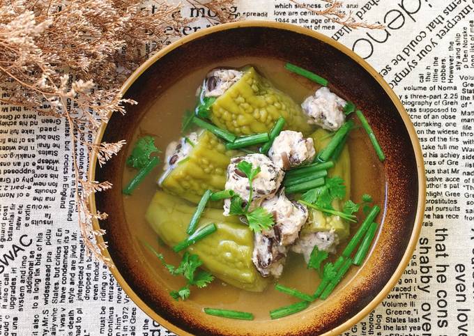 Xay nhuyễn các nguyên liệu là khổ qua, tàu hủ ky, mì căn và gia vị chay như hành tím, tỏi, gừng, tiêu, muối, đường, dầu hào. Trộn đều các nguyên liệu và nhồi vào trong khổ qua.