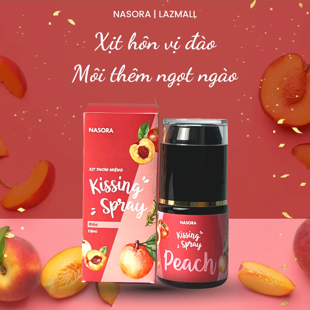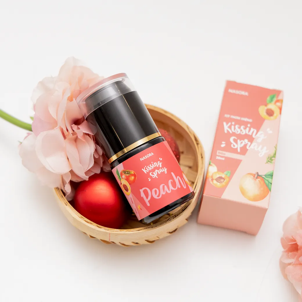 Dòng sản phẩm Xịt thơm miệng Kissing Spray Nasora có 3 mùi hương Đào, Việt Quất, Bạc Hà, trong đó Hương Đào thanh khiết mang mùi hương từ sự ngọt ngào của vị Đào tươi trẻ, phù hợp với những nụ hôn nhẹ nhàng của những ngày hẹn hò tình cảm.