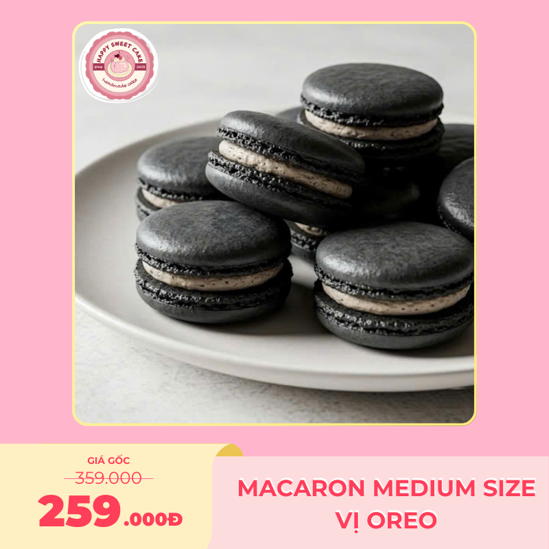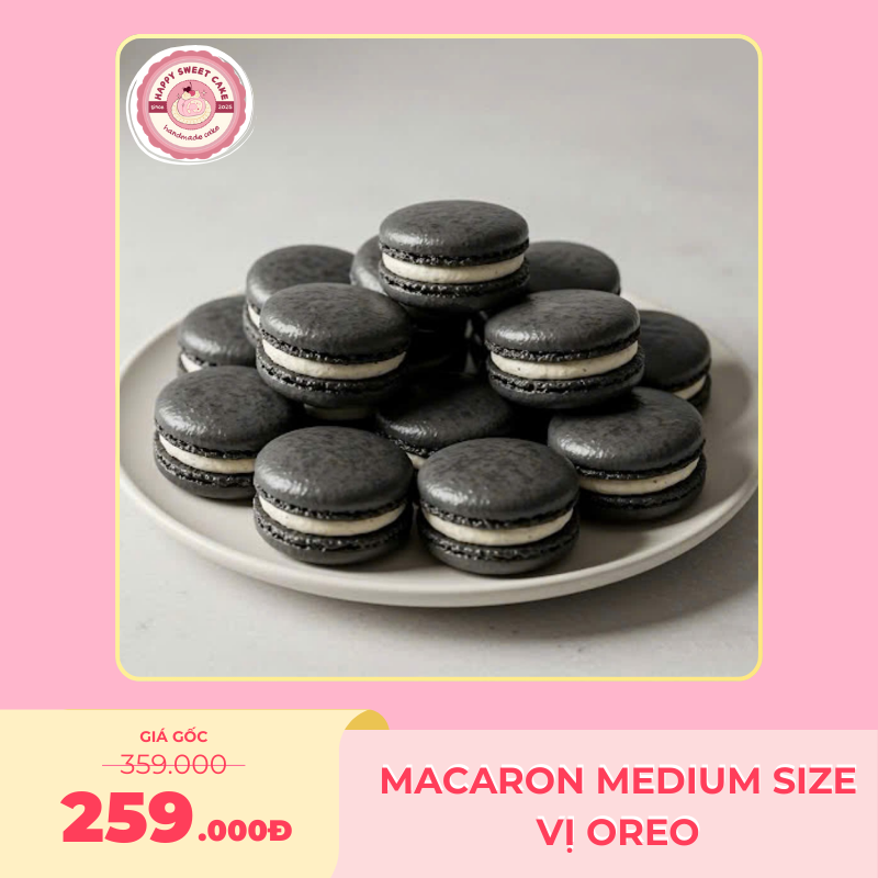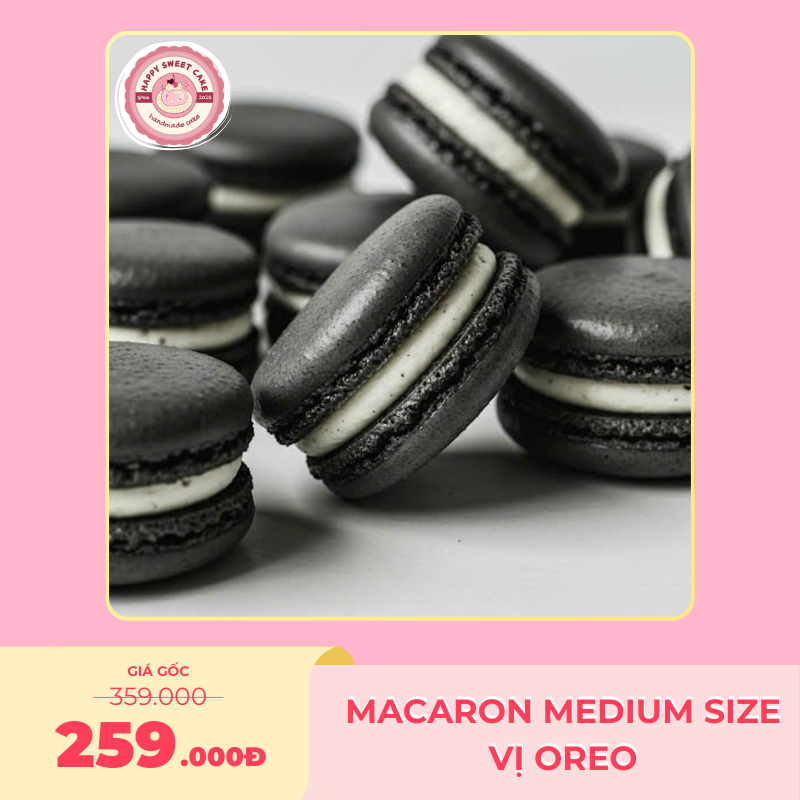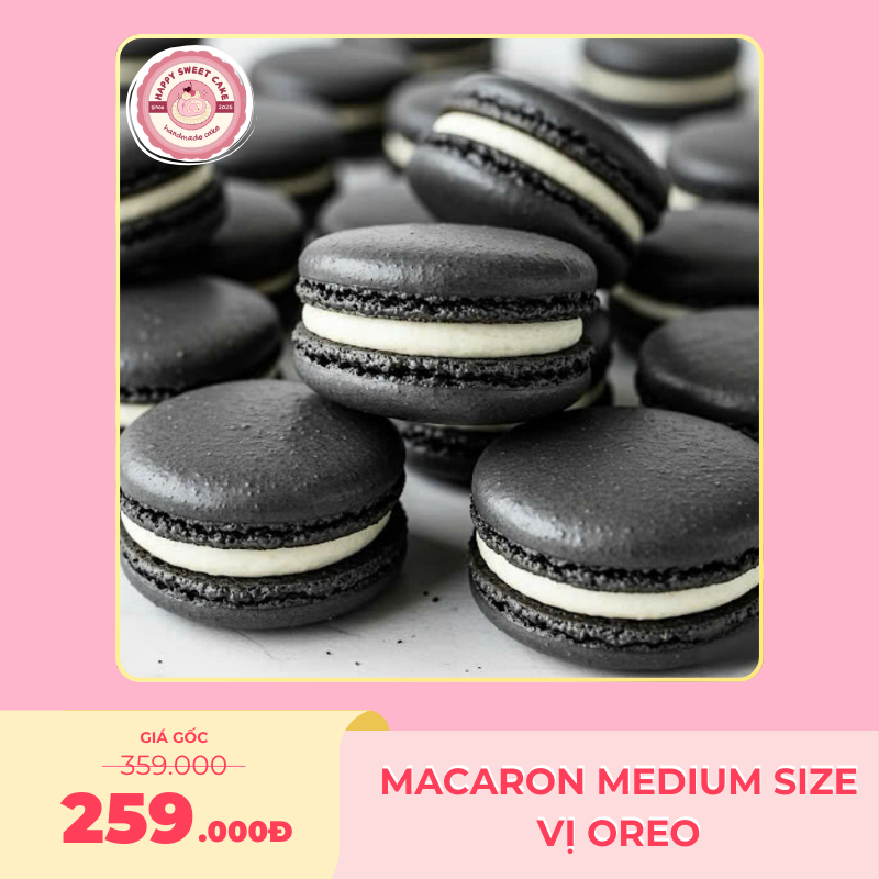 Thưởng thức macaron medium size vị Oreo – lớp vỏ hạnh nhân giòn nhẹ, quyện cùng nhân kem Oreo mịn màng, thơm lừng chocolate – vanilla. Vị ngọt dịu, béo vừa phải nên ăn hoài không ngấy, “đốn tim” cả người lớn lẫn trẻ con!