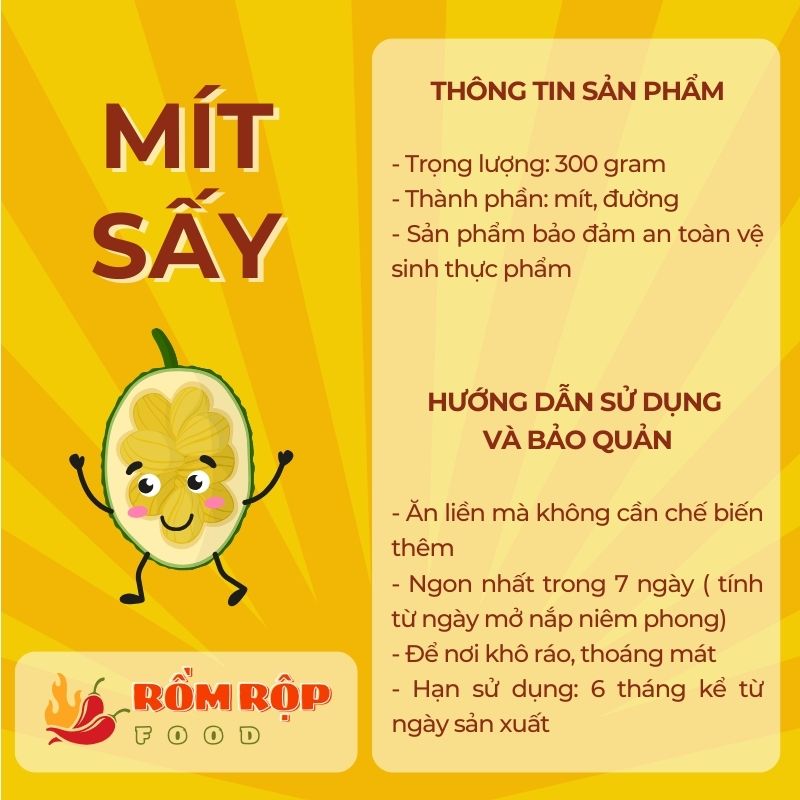 Mít sấy khô là một loại đồ ăn vặt khoa học và ngon miệng, được chế biến từ trái mít tươi bằng cách loại bỏ nước thông qua quá trình sấy. Mít sấy khô giữ lại hương vị tự nhiên của mít, nhưng có cấu trúc giòn và ngọt ngon hơn. Sản phẩm này là nguồn khoáng chất, chất xơ và năng lượng dồi dào, là một lựa chọn dinh dưỡng cho người ưa thích ăn vặt lành mạnh. Mít sấy khô thường được ăn trực tiếp hoặc thêm vào các món ăn như salad, smoothie, hay bánh ngọt để tạo thêm hương vị.