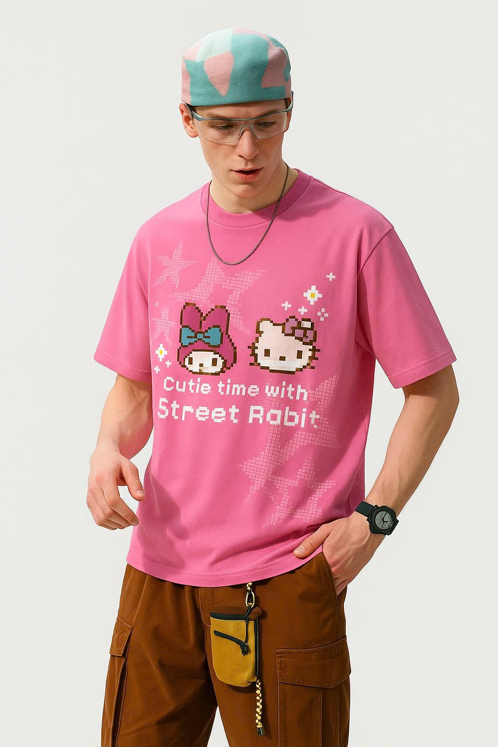 Điểm nhấn chính của chiếc áo là phần hình in mang phong cách pixel art – xu hướng thiết kế hoài cổ đang “làm mưa làm gió” toàn cầu. Hai nhân vật hoạt hình được thể hiện bằng đồ họa pixel giống như trong các tựa game 8-bit cổ điển, tạo cảm giác retro cực chất. Dòng chữ “Cutie time with Street Rabbit” như lời tuyên bố vui tươi và tích cực – một thông điệp đáng yêu dành cho những ai yêu thời trang.