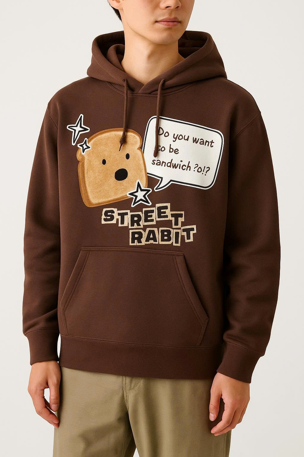 Điểm nhấn ấn tượng của Sandwich Toast Hoodie chính là hình ảnh lát bánh mì nướng với biểu cảm “ngơ ngác” siêu dễ thương kèm theo câu thoại “Do you want to be a sandwich? :0!?” in nổi bật ngay trước ngực. Thiết kế này mang đến sự vui nhộn, hài hước, đồng thời thể hiện chất “nghịch ngợm” đặc trưng của Street Rabbit.