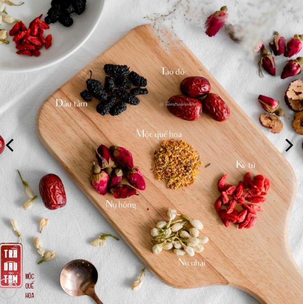 ❖ Thành phần: Dâu tằm, táo đỏ, nụ hồng, mộc quế hoa, kỷ tử, nụ nhài
