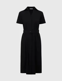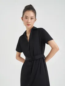 Váy liền dài cổ đức, ngắn tay. Kiểu dáng rộng vừa, có dây thắt eo tôn dáng.